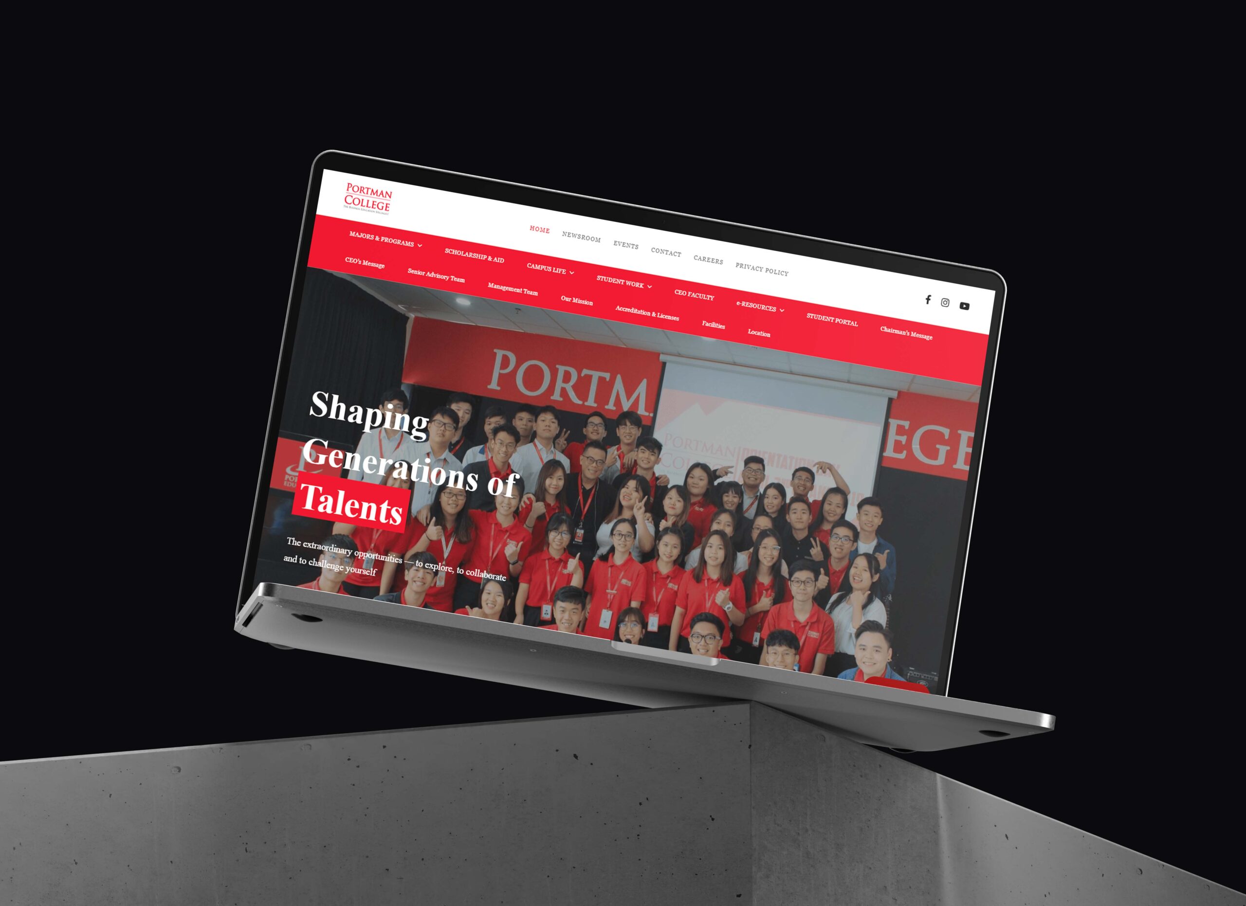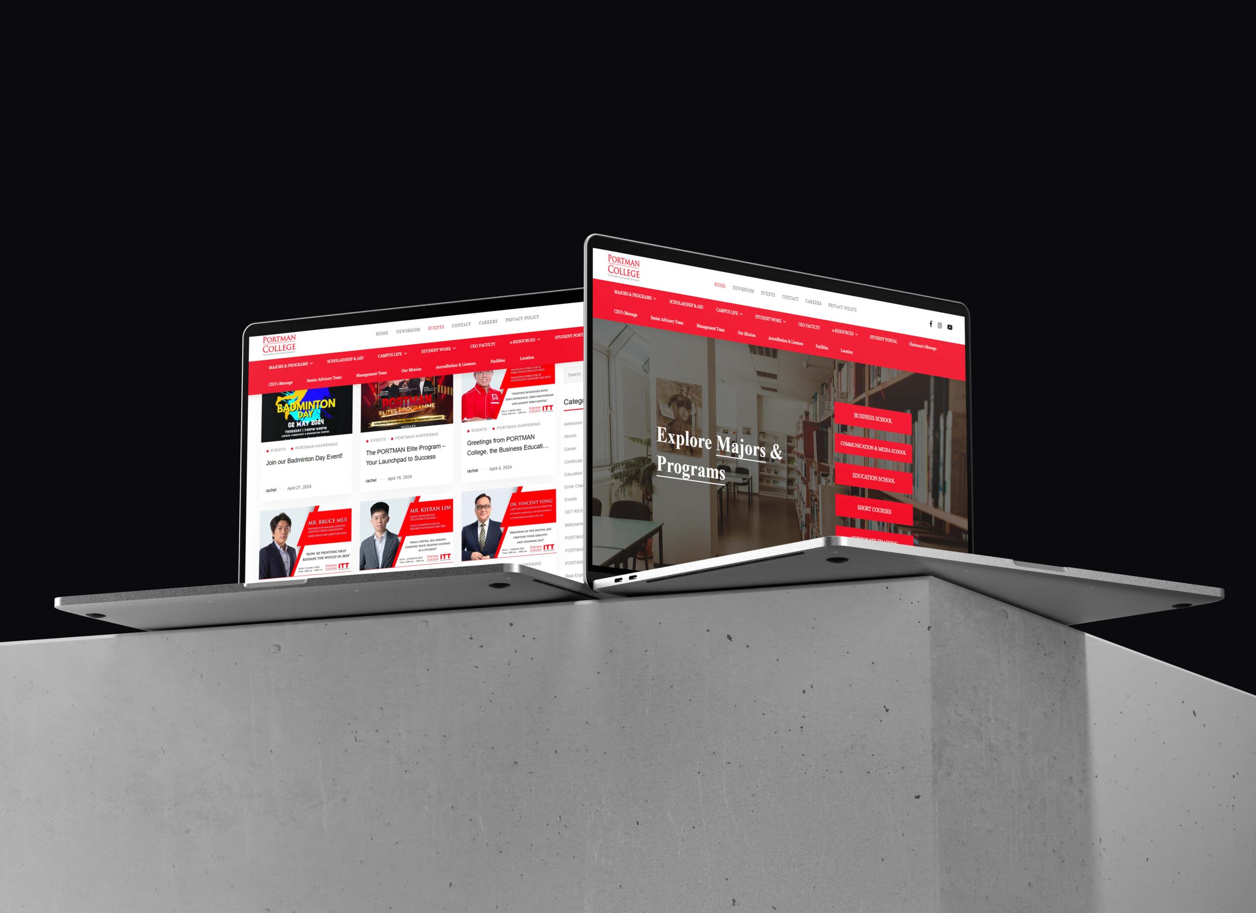 We adopted a modern, formal layout anchored by PORTMAN’s signature red—a color symbolizing leadership and passion. Clean typography, structured content hierarchy, and precise spacing guide users through academic programs, campus life, and admissions information seamlessly. The design emphasizes credibility, accessibility, and engagement, ensuring the experience feels both inspiring and trustworthy.